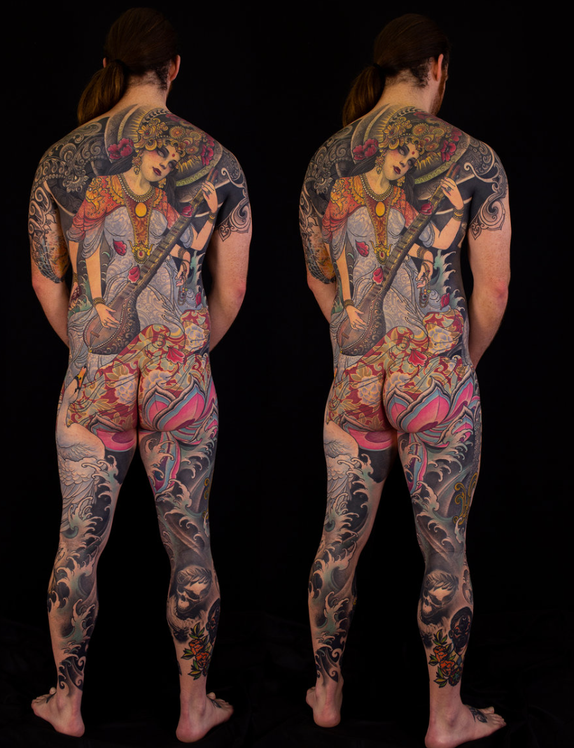Jeff Gogué did his first tattoo in August of 1999 in Northern California. Self taught, he's been influenced by people like Filip Leu and Shige and strives for creative, dynamic, Japanese-inspired work; detailed where needed, loose and simple where it can be. He is an internationally acclaimed, award winning tattooer in England, France, Italy, Australia, the US and Japan.