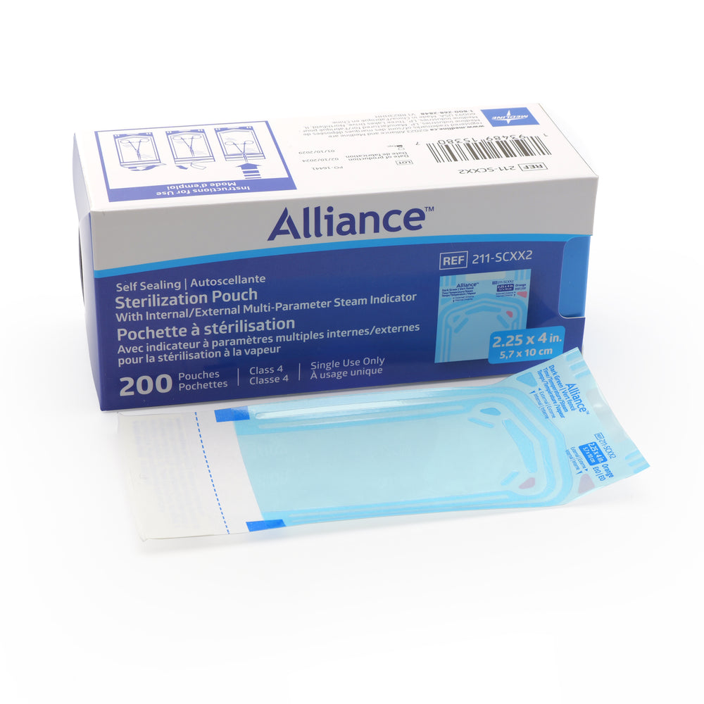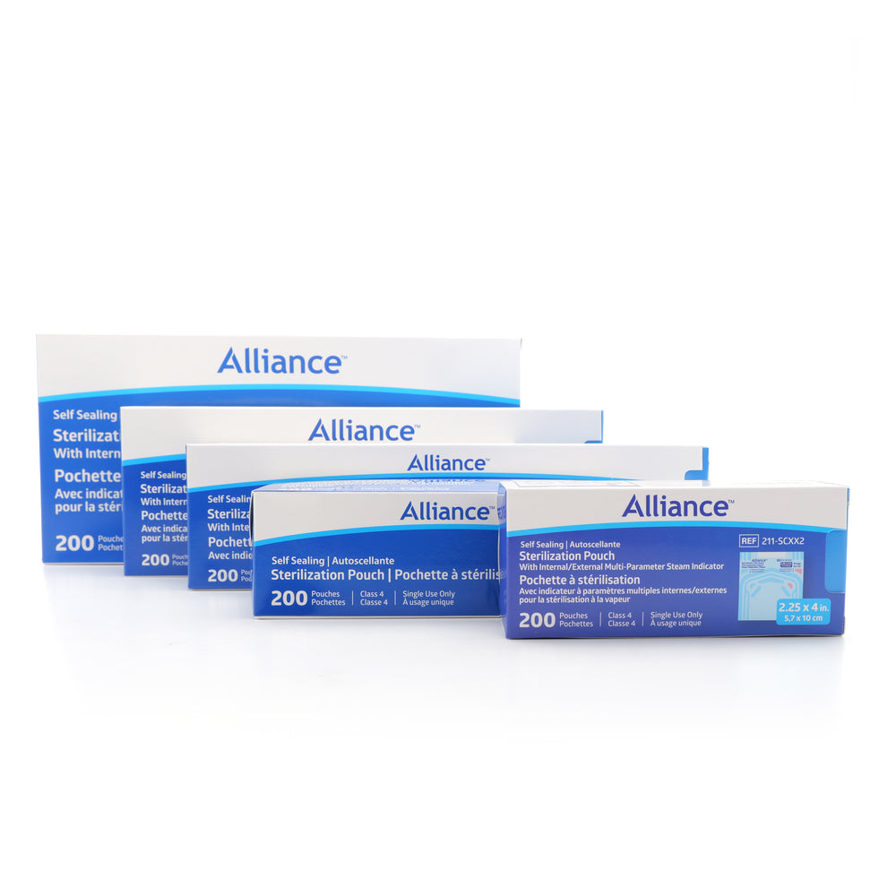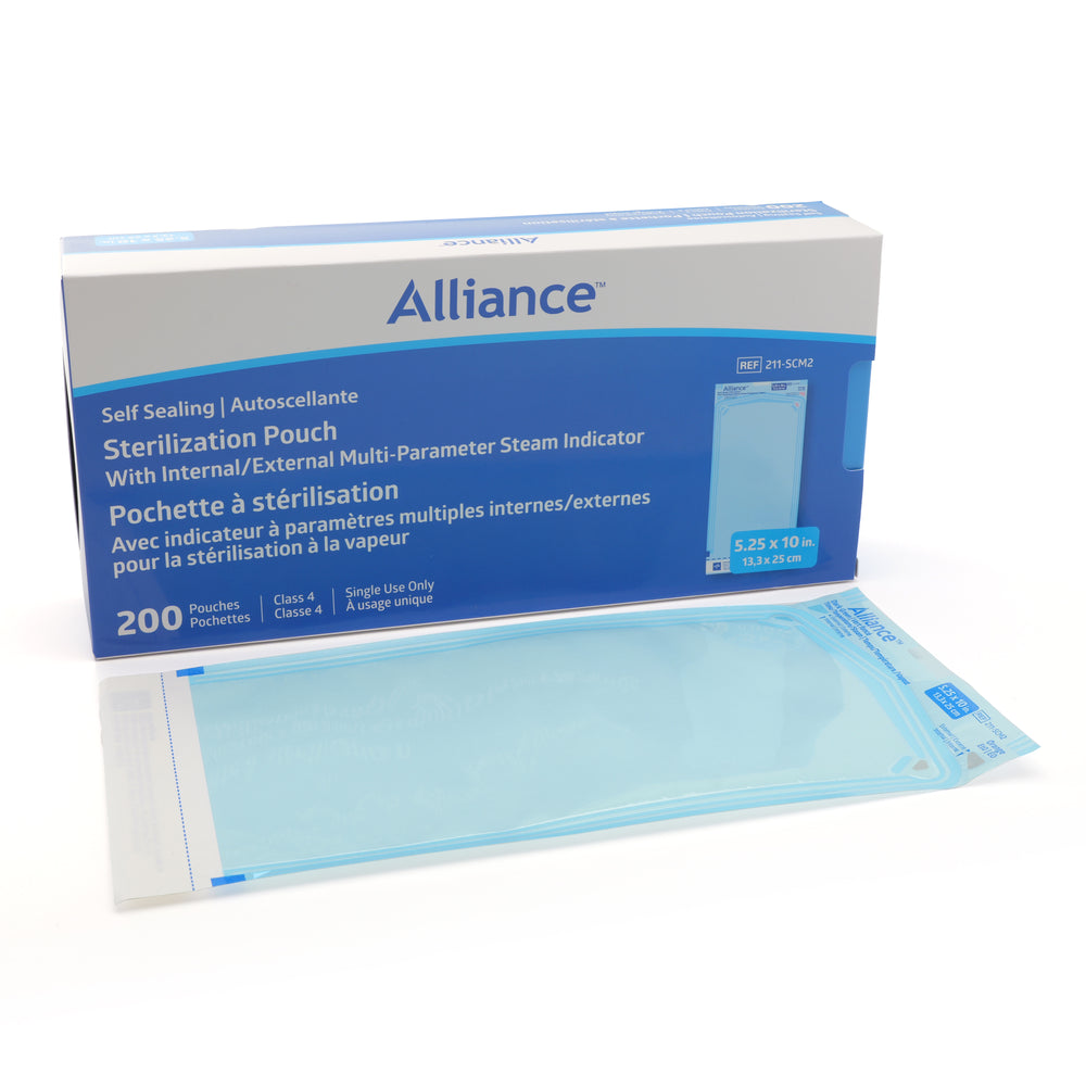 Alliance Self-Sealing Sterilization Pouches are a Class 4 pouch, with 2 sets of lead-free indicator inks that turn dark green when they meet these 3 parameters: time, temperature and steam.
