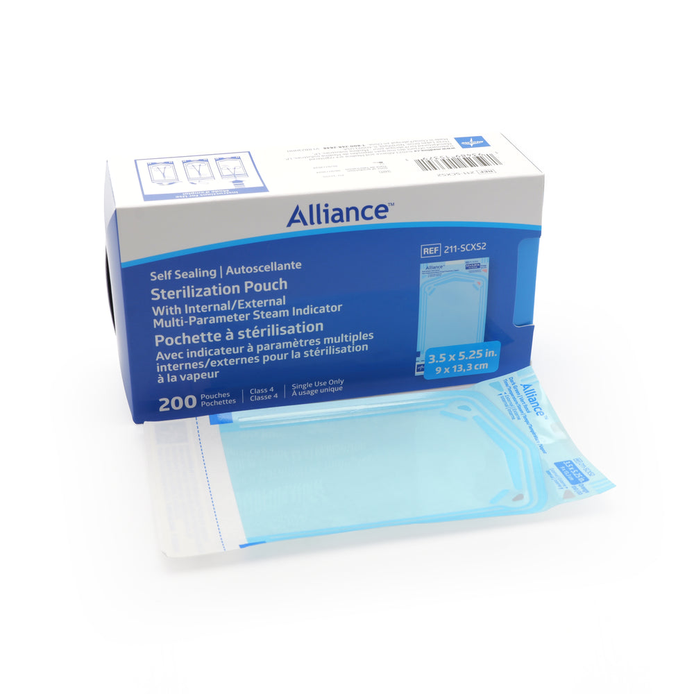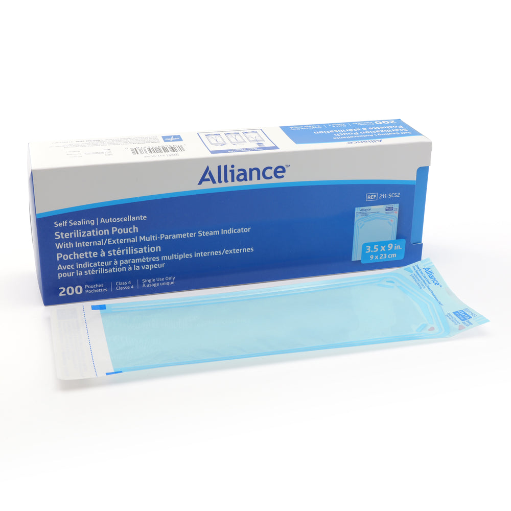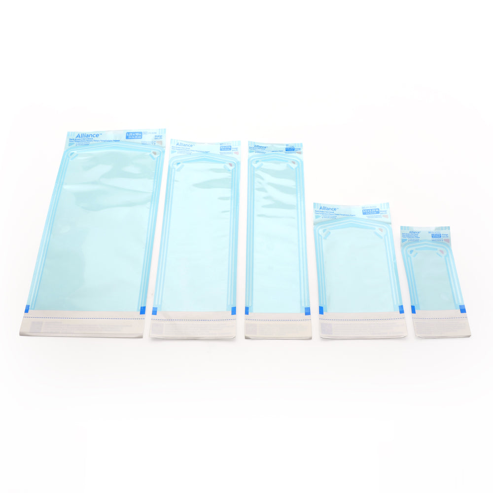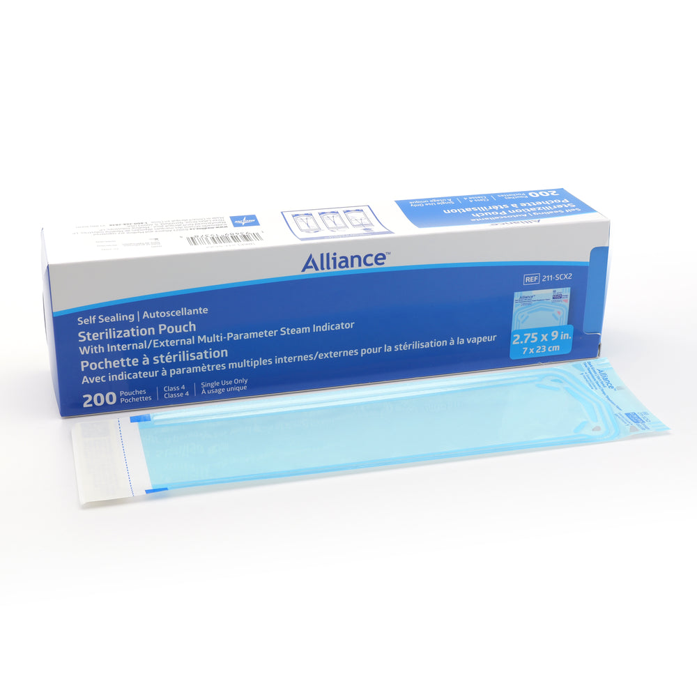 Alliance Self-Sealing Sterilization Pouches are a Class 4 pouch, with 2 sets of lead-free indicator inks that turn dark green when they meet these 3 parameters: time, temperature and steam.