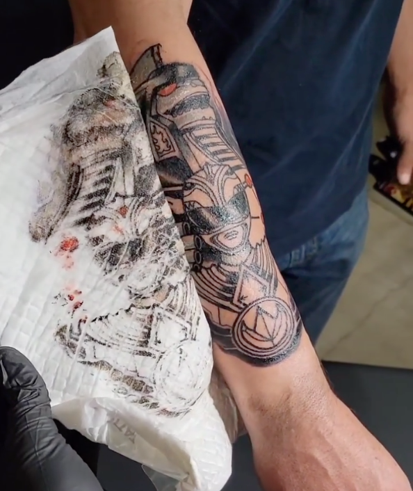 By this we mean clean the area of any excess plasma and blood. Use clean gloves when doing so. Remember that a fresh tattoo is an open wound, you definitely want to avoid any form of infection at all costs! Remember that bad healing is bad business.