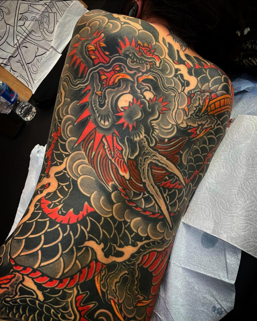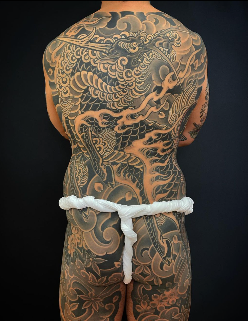 Horitomo has been tattooing for over twenty years and is well versed in Japanese tradition including tebori (Japanese hand tattooing). He currently works at State of Grace Tattoo in San Jose, California. He has done extensive design work for Sega Game Systems and has also exhibited at the Asian Art Museum San Francisco as well as the Japanese American National Museum in Los Angeles.