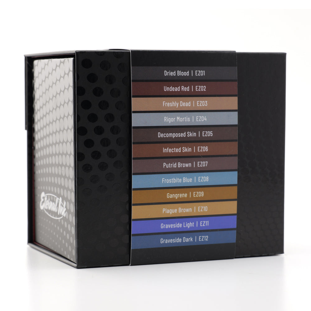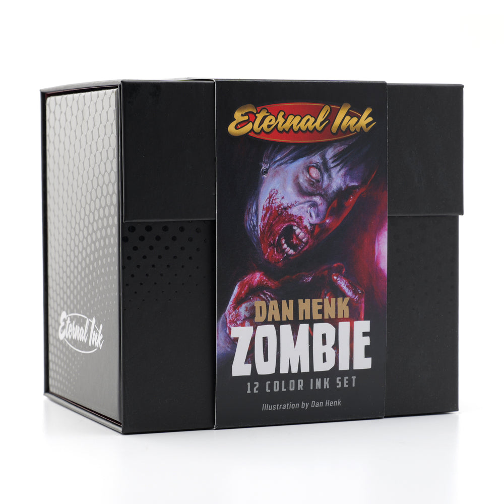 Eternal Ink's Dan Henk Zombie Colours set is a moody collection of flesh-tone browns, muddy reds, dirty purple and murky blues mixed to capture the living dead in full moonlight. This versatile set works equally well on the living, too. The Zombie set includes one of the best flesh tones we have ever seen and the miraculous Frostbite Blue that can't be duplicated. The 1 oz bottles are great for travel and conventions.