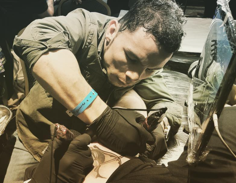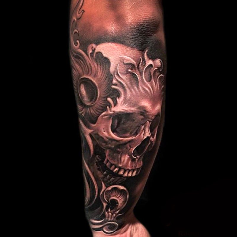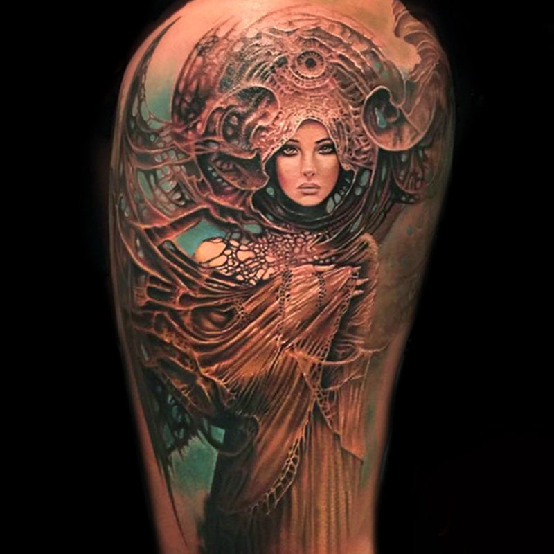 Rember Orellana tattoos with a style as unique as his background. Born in Guatemala, his boxing career ended early due to a permanently detached retina. At first a tragic turn, Rember soon recognized it as a hidden asset by giving him an altered perspective for depth and dimension in his art. His hyper-realistic tattoo art mixes smoothly with surrealism and gothic architecture to create truly amazing images in the art of tattooing. Working easily in black and grey or colour or blending it all with sepia tones, Rember’s art captures his personal creative vision to create skin art of inspiration and mystery.