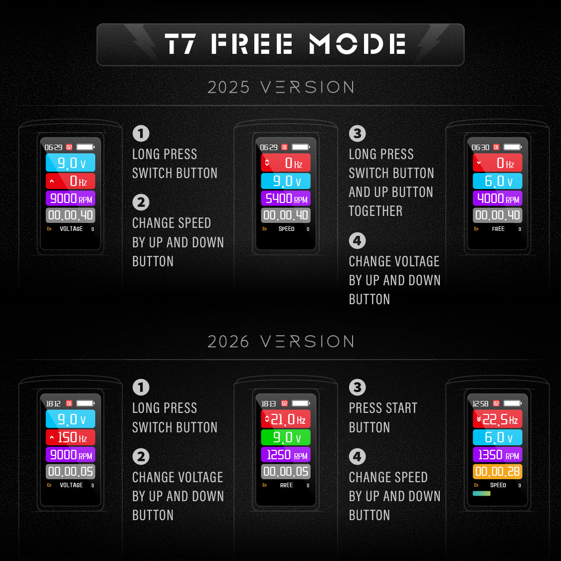 Free Mode allows you the freedom to customize voltage and speed separately to create your personalized setup: “4v to 12v” “3hz to 150hz” and “180rpm to 12000rpm”.